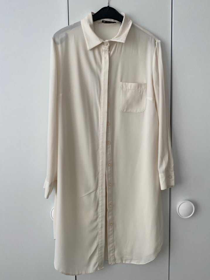 Bej renkli, krep tril tril kumaştan, düğmeli ön ve göğüs cebine sahip, uzun kollu ve yakalı midi uzunlukta bol kesim gömlek. Minimalist tarz, ofis kullanımı için uygundur. Ürün 1 kez giyildi sıfır ayarında