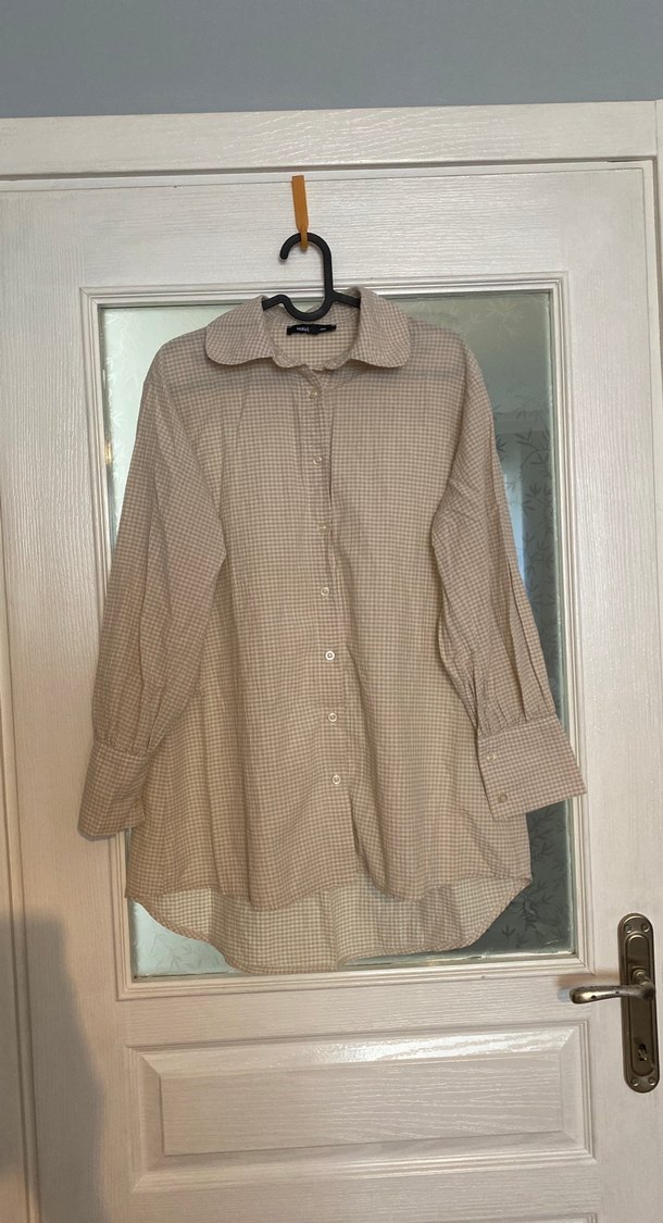 Bej pamuklu gömlek, düğmeli ön ve yakalı tasarıma sahiptir. Uzun kollu, normal , rahat kesimdir. Standart beden 34-40 beden aralığına rahat olur hiç bir defosu yoktur
