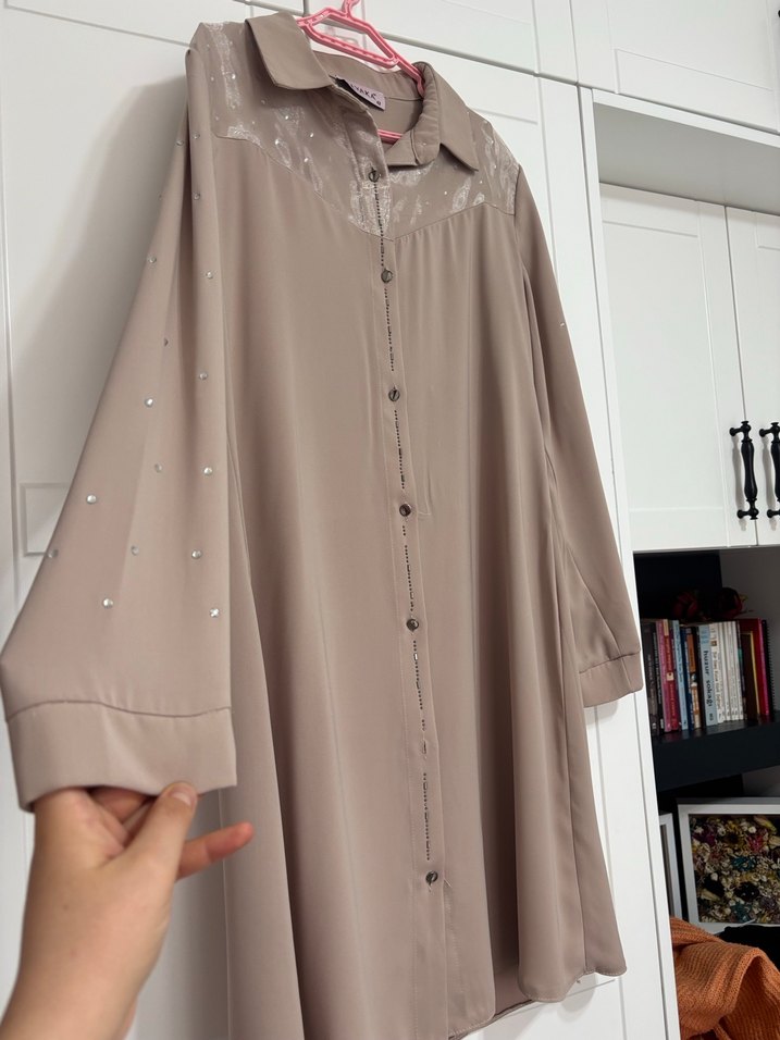 Bej renkli, düğmeli ve uzun kollu salaş kesim tunik. Omuz ve kollarda zarif detaylar bulunur. Yumuşak kumaştan üretilmiştir.