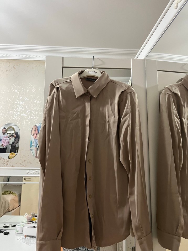 Bej renkte, saten kumaştan uzun kollu kadın gömlek. Düğmeli ve yakalı olup, regular kesim ve midi boydadır. Ofis ve günlük kullanım için uygundur.
