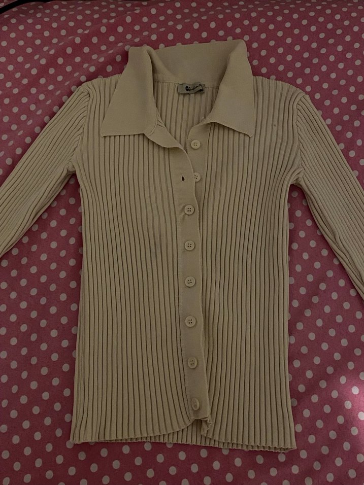 Bej renkte, düğmeli ve uzun kollu, yakalı triko kazak. İnce dokusu ve rahat kesimi günlük kullanıma uygundur.