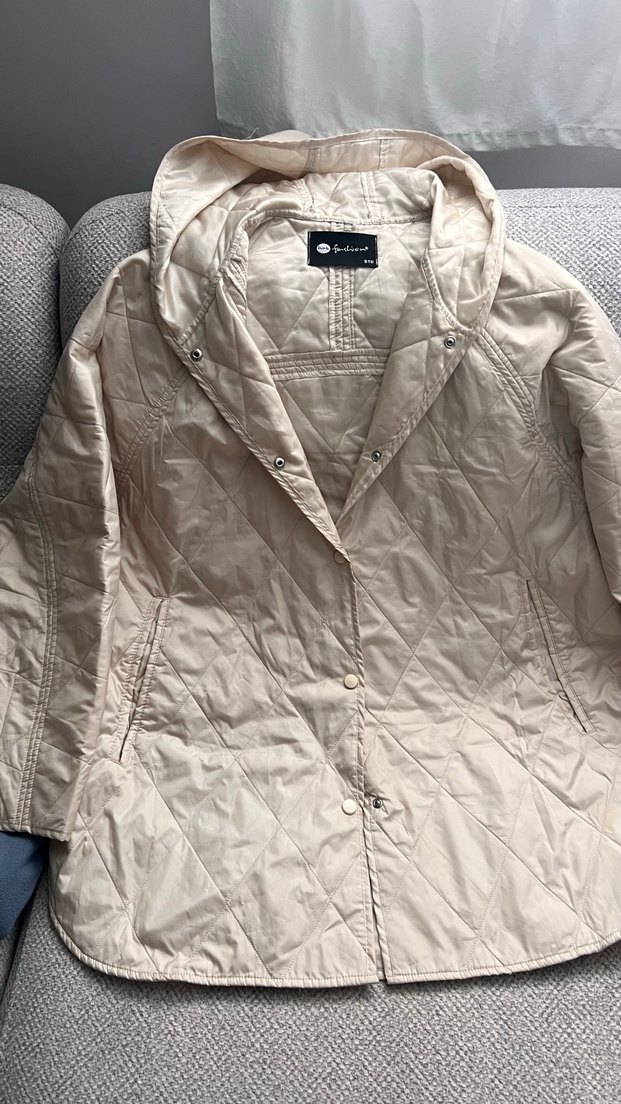 Bej keten kumaştan, düğmeli, uzun kollu, normal boyda, rahat kesim kadın yağmurluk. Ufak bi leke dışında bir şeyi yoktur