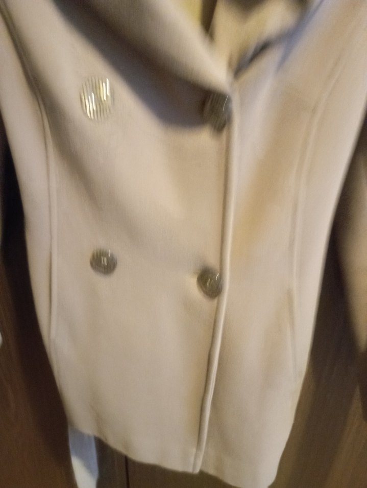 Bej renkli, parlak dokulu, kolsuz kadın ceket. Düğmeli ve kruvaze yakalı, klasik şıklık için ofise uygun uzun kesim.