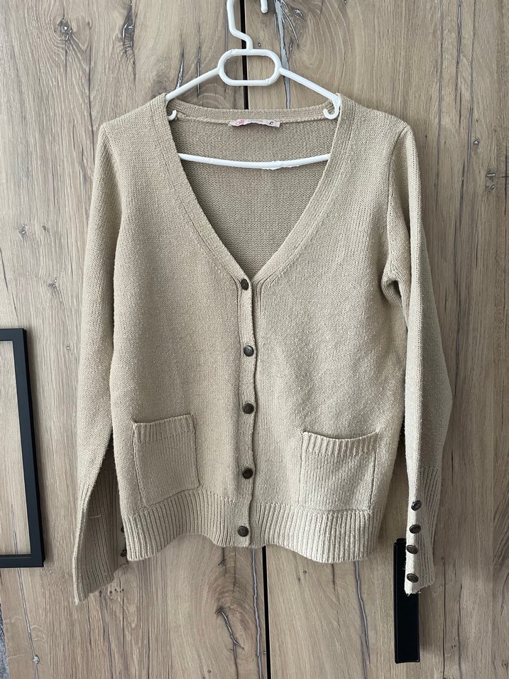 Bej renkli, düğmeli, V yakalı örme kadın hırka. Uzun kollu, manşet düğmeli ve önünde iki cep bulunur. Rahat kesimi ve midi boyu günlük kullanım için uygundur. Çok az kullanıldı M,L beden