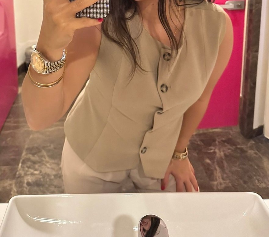 Bej renginde, düğmeli ve V yakalı kolsuz yelek. İpeksi kumaştan, kısa boyda ve rahat kesimdir, iş ortamı için uygundur. S-M bedene uygun