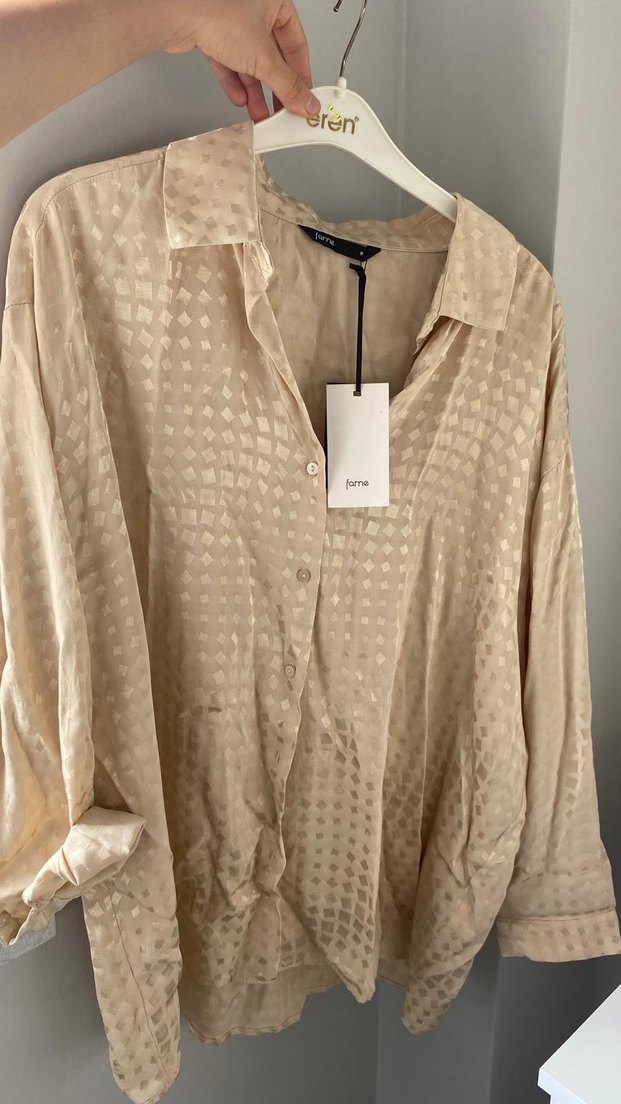 Bej renkli, parlak görünümlü saten gömlek, uzun kollu ve düğmeli. V yakalı, bol kesim ve normal boyda