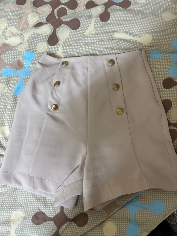 Bej renk, düğmeli detaylı, yüksek bel ve mini uzunlukta, sentetik kumaştan yapılmış şık ve fit kesim şort.