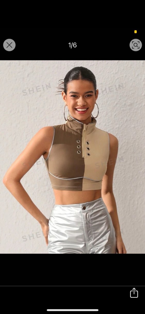 Düğmeli, yüksek yakalı ve sıkı kesim sleeveless crop top. Bej ve gri tonlarda deri malzemeden yapılmıştır, günlük kullanıma uygundur.