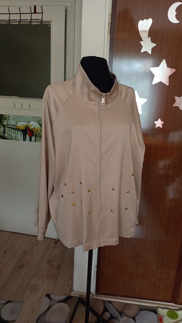 Bej renkli, yüksek yakalı ve düğmeli detaylı salaş kesim ceket. Uzun kollu ve parlak görünümlü, rahat sokak stili için uygun.