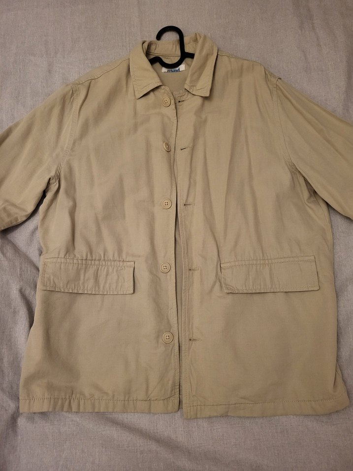 Bej keten kumaştan, düğmeli aslında erkek ceketi ama ben kuşlandım deformesi yok.