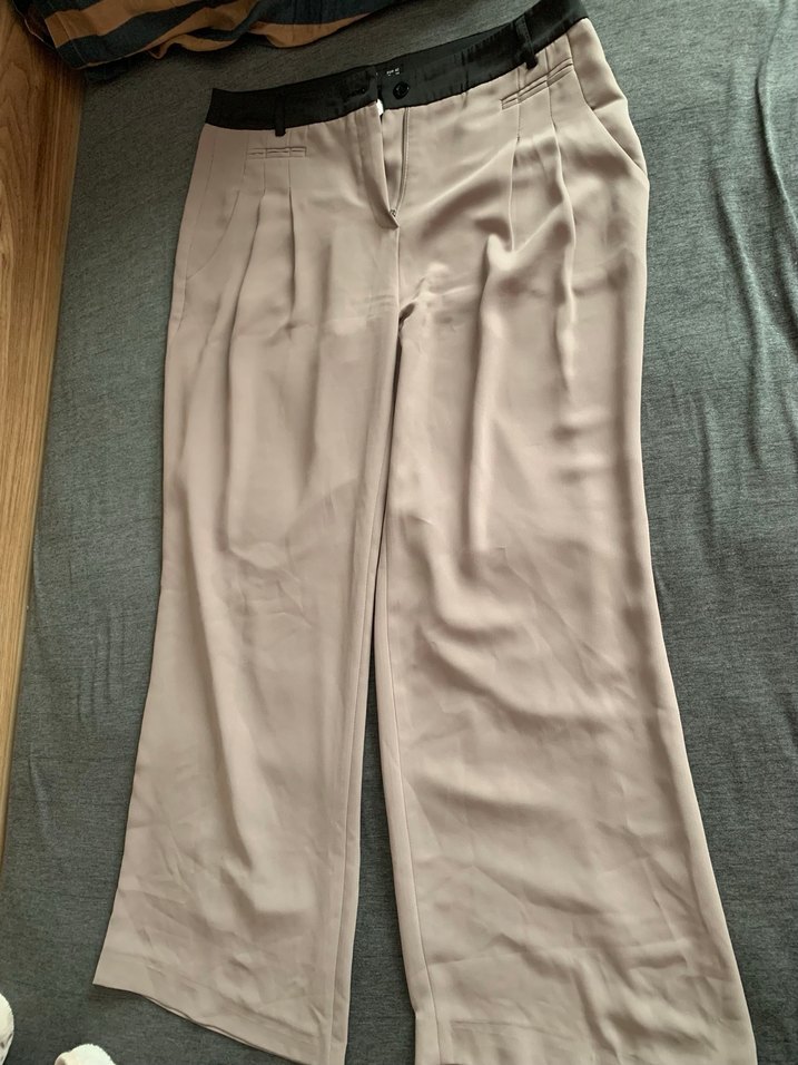 Bej renkte, rahat kesim 167 boyundayım boyu bana tam oluyor, bel kemer görünümlü kadın pantolonu. İpeksi dokusu ve düz desenli. 42 beden yazıyor ancak 38 beden birine vintage ve baggy görünümlü oluyor. Hiç bie kusuru yok