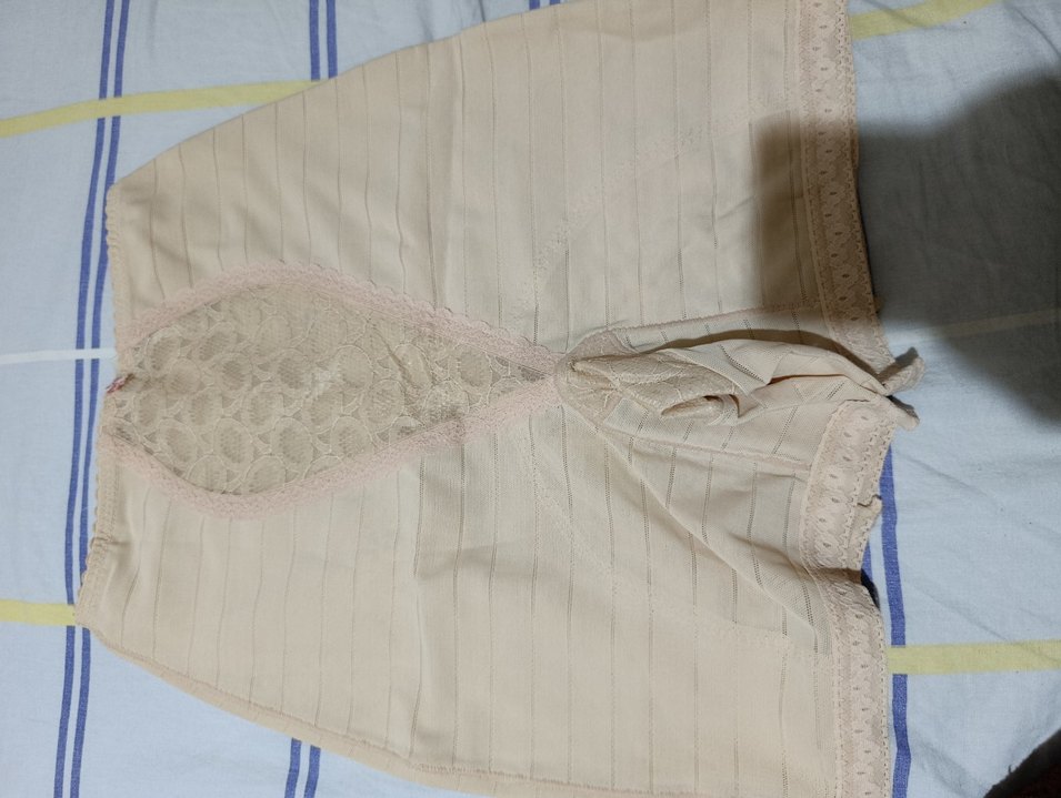 Bej renkte, düz desenli ve dantel detaylı, midi boyda, vücuda oturan hemşire korsesi. Rahat ve destek sağlar.