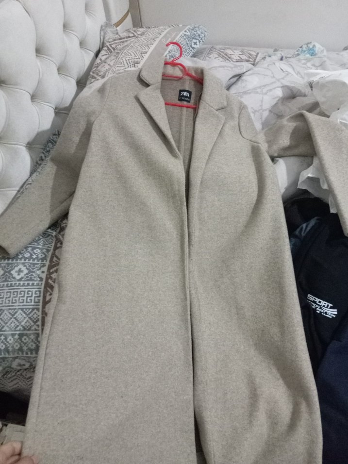 Bej renkte, düz kesim ve klasik yakalı, yumuşak ve sıcak kumaştan kaban. Düğmesiz sade tasarıma sahip.