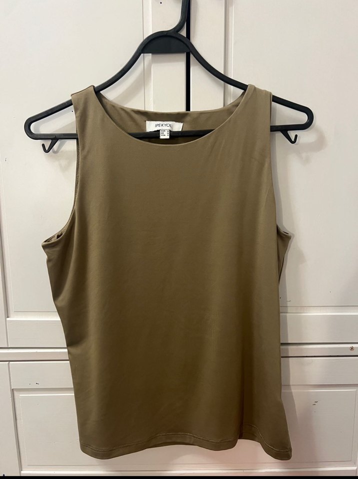Bej renkte, kolsuz ve yuvarlak yaka tasarıma sahip, düz kesim kadın atlet. Sentetik kumaştan üretilmiş, günlük kullanıma uygun minimalist tarzda.