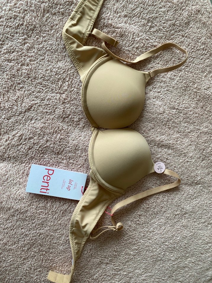 Penti markalı bej renkli, düz ve minimalist tasarımlı sütyen. Rahat oturuşlu, hafif renkli ve normal uzunlukta askılı, streetwear stiline uygun.
