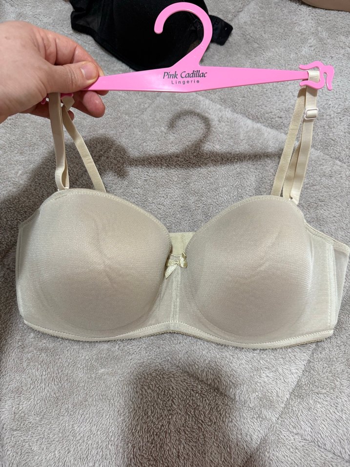 Bej, desensiz, ayarlanabilir askılı sütyen. Normal uzunlukta, minimalist tarza sahip, yumuşak kumaşlı rahat kullanımlık. Marka: Pink Cadillac. 95c beden penti lotus sütyen