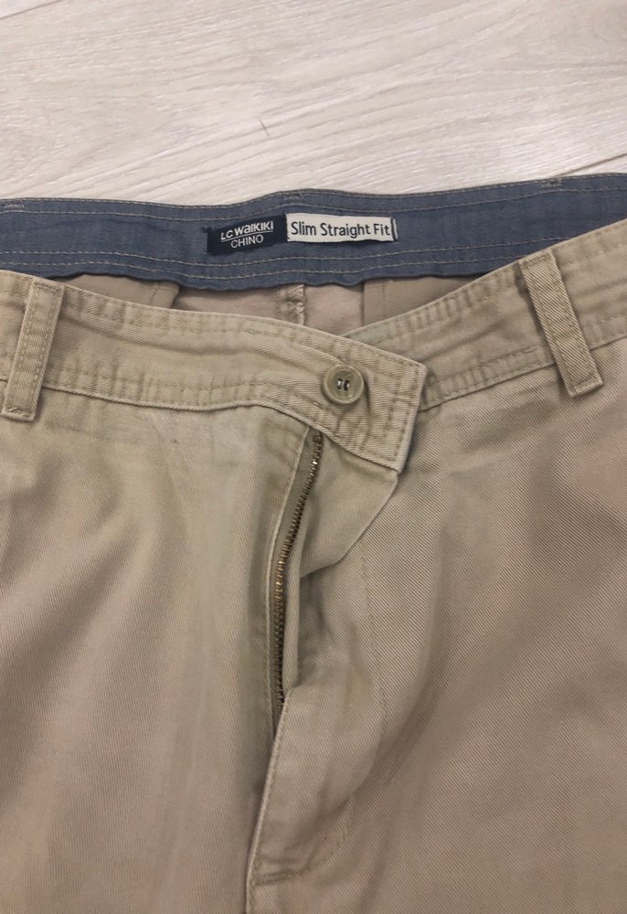 Bej renkte, düz ve modern tarzda bir pantolon . Şık sadece ağ kısmında aşınma var