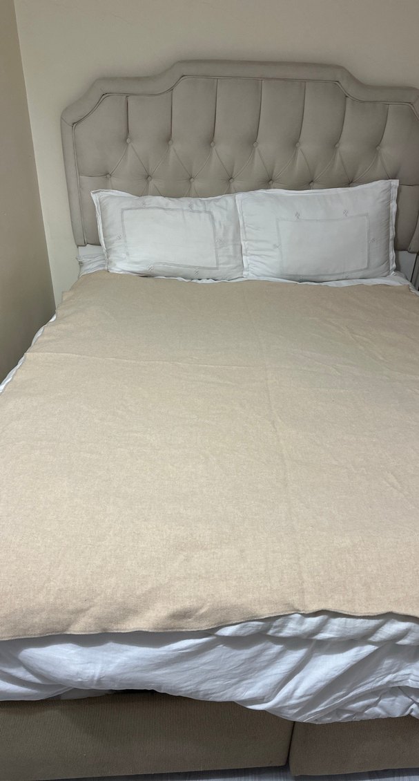 Bu açık bej renkli yatak örtüsü, düz ve desensiz yapısıyla sade ve şık bir görünüm sunar. ️