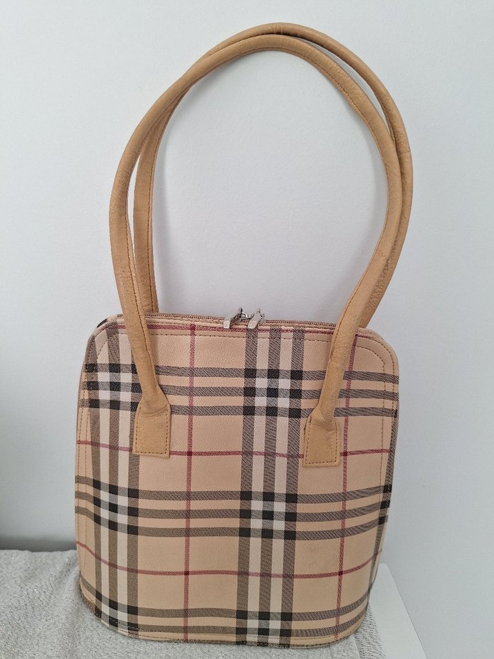 Bej tonlarında ekose desenli deri çanta, fermuarlı ve uzun kulplu, çağdaş Paris tarzını yansıtıyor.