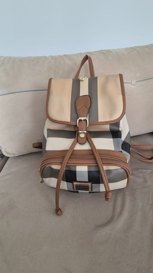 Bej ekose desenli, deri malzemeden yapılmış, tokalı kayışlara sahip kadın sırt çantası. Sokak modası ve Paris tarzını yansıtır, günlük kullanıma uygundur.