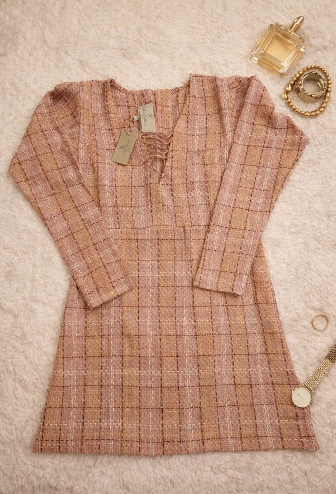 Hiç giymedim etiketi üstünde. 36 bedene uygundur. Uzun kollu ve V yaka olan bu yün elbise, rahat kesimi ve örme ekose deseniyle günlük kullanım için uygundur.