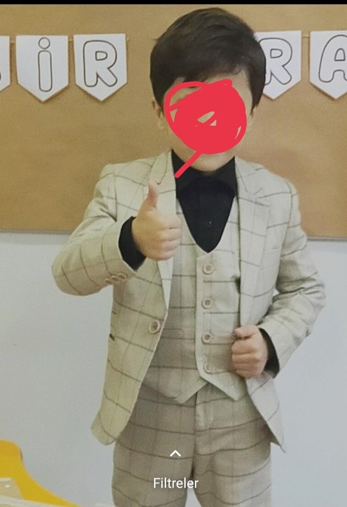 Bej renkte, gri ekose desenli, normal boy ve regular fit erkek takım elbisesi. Uzun kollu, düğmeli ve kesimli yaka detaylarına sahip. 4 yaşında 2 saat kullanıldı