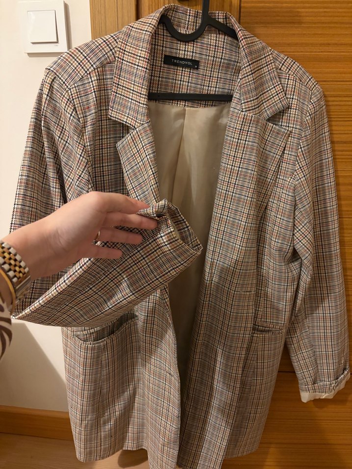 Bej ekose desenli kadın blazer ceket, notched lapel yakalı, uzun kollu ve düğmeli detaylıdır. Rahat kesim ve midi boy, yumuşak sentetik kumaştan üretilmiştir. 36-40 uygundur.