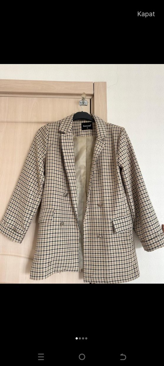 Bej renkli, ekose desenli kadın blazer ceket, düğmeli ve normal kesimdir. Uzun kollu, sentetik kumaştan üretilmiştir, günlük şık tarz için uygundur.