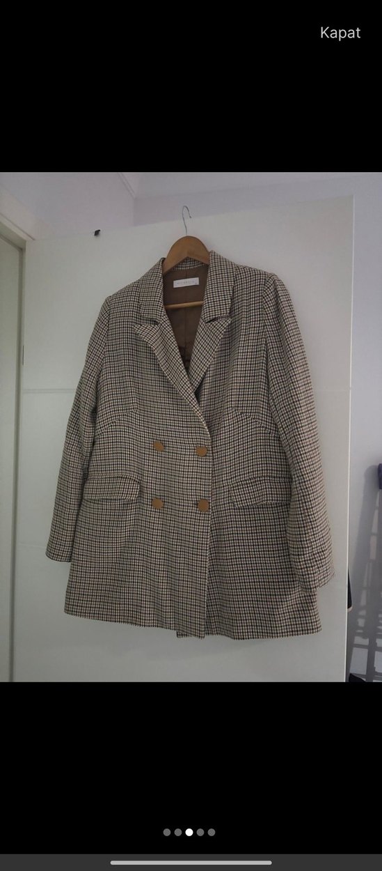Bej ekose desenli blazer, düğmeli ve uzun kolludur. Normal kesim ve midi boyda, sentetik kumaştan yapılmıştır. Günlük rahat kullanıma uygundur.