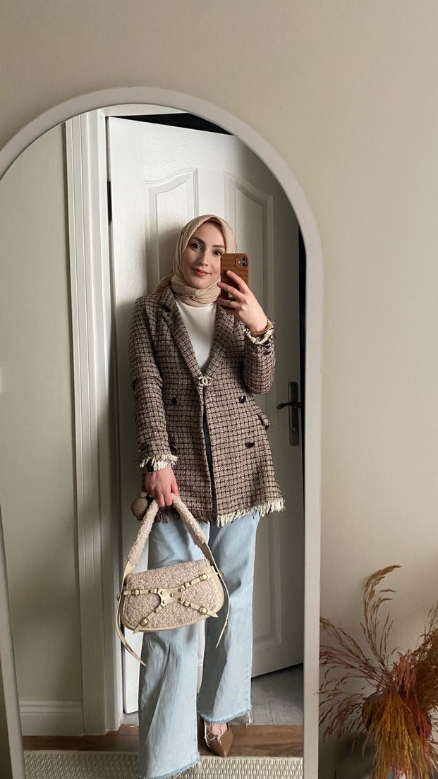 Bej Ekose Desenli Kadın Midi tüvit Blazer