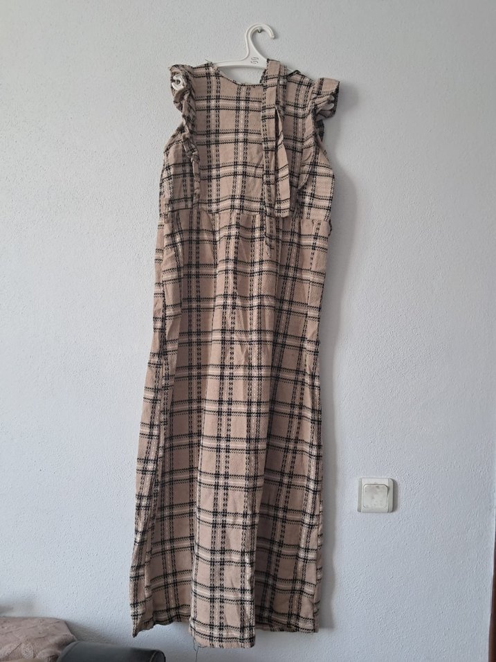 Bej ekose desenli, kolsuz, bol kesim uzun elbise. Keten kumaştan, yakalı ve günlük kullanıma uygun vintage tarzda.