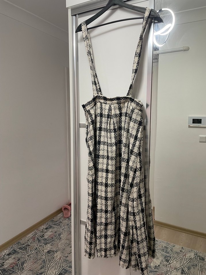 Bej tonlarında, ekose desenli, bol kesim ve drapeli midi hamile eteği. Yumuşak sentetik kumaştan üretilmiş, günlük kullanıma uygun, Paris sokak modası tarzında.
