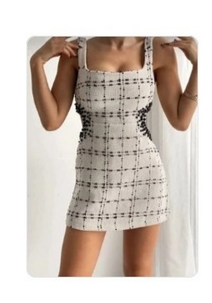 Bej ekose desenli, örme kumaştan yapılmış, straplez ve kolsuz mini elbise. Yanları açık kesimli, Paris sokak modasını yansıtan şık bir tasarım.