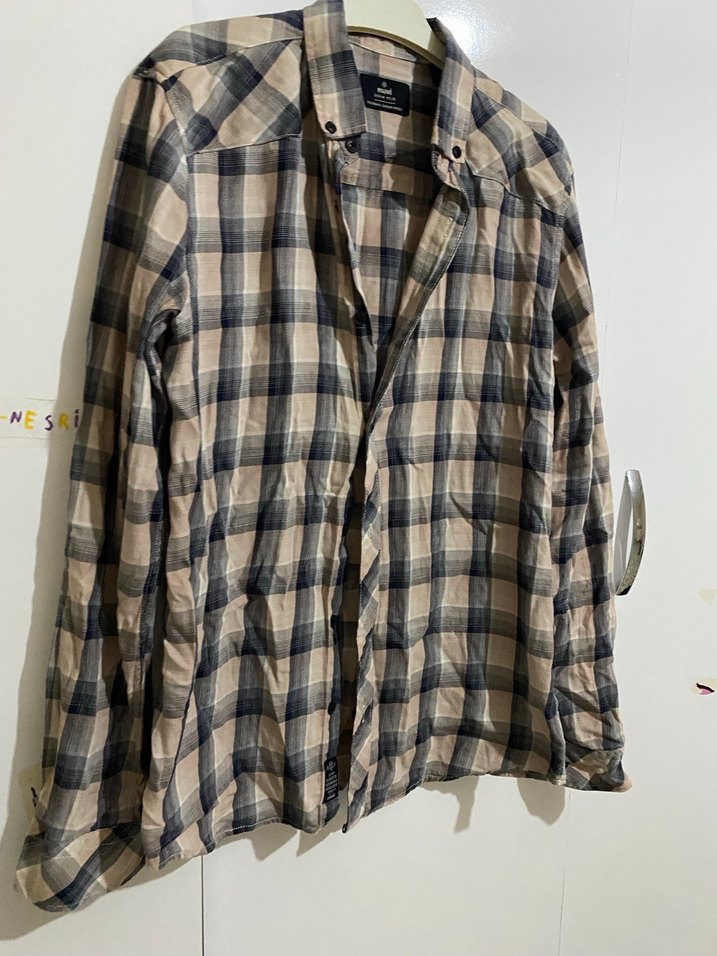 Uzun kollu, yakalı . Yumuşak keten kumaştan yapılmış, bej ve gri ekose desenli, rahat sokak stili için uygun. Düğmeli tasarım içerir. Mavi marka