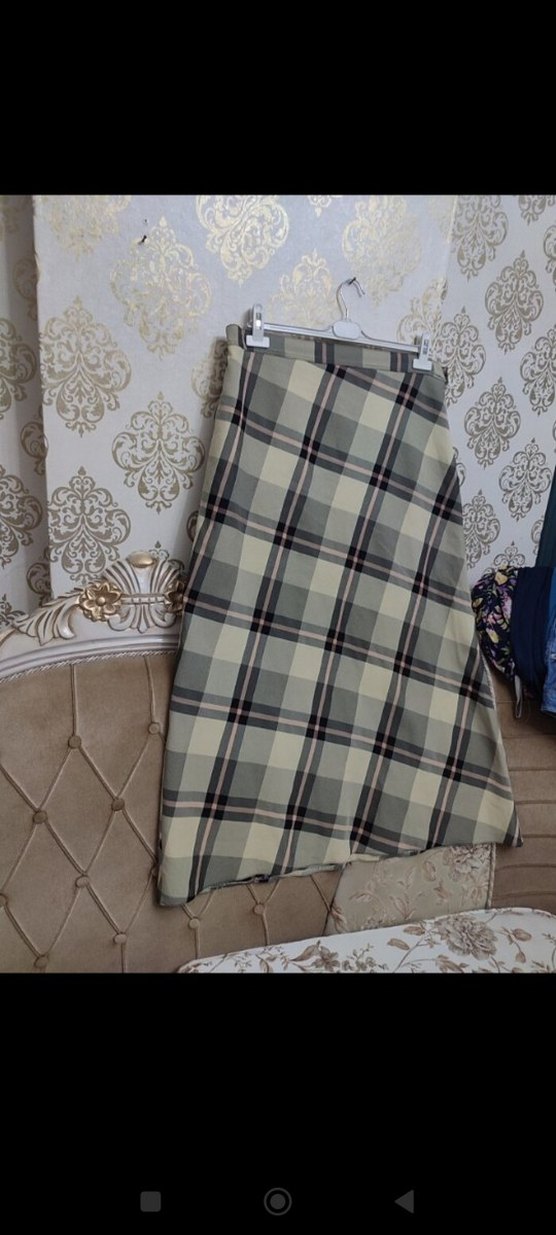 Bej renkte uzun, ekose desenli ve drapeli kadın eteği. Sentetik kumaştan yapılmış, rahat kesim ve günlük kullanıma uygun.52 ben diyor ama 42 beden olur yada 44