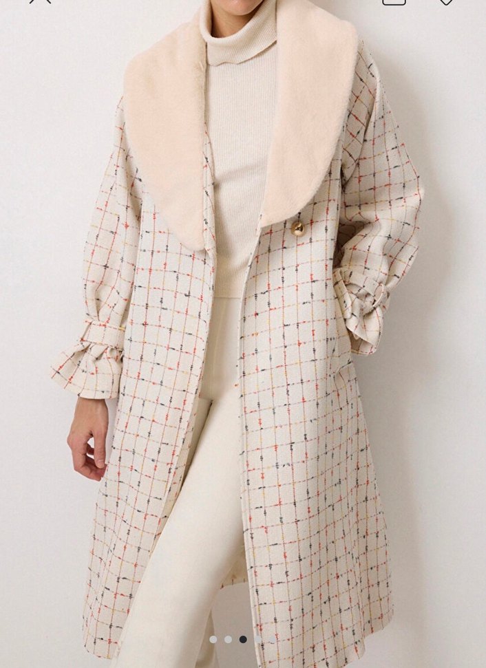 Bej renkte, ekose desenli, uzun ve regular fit kadın kaban. Geniş kürk detaylı yakası ve uzun kolları ile günlük kullanıma uygundur.