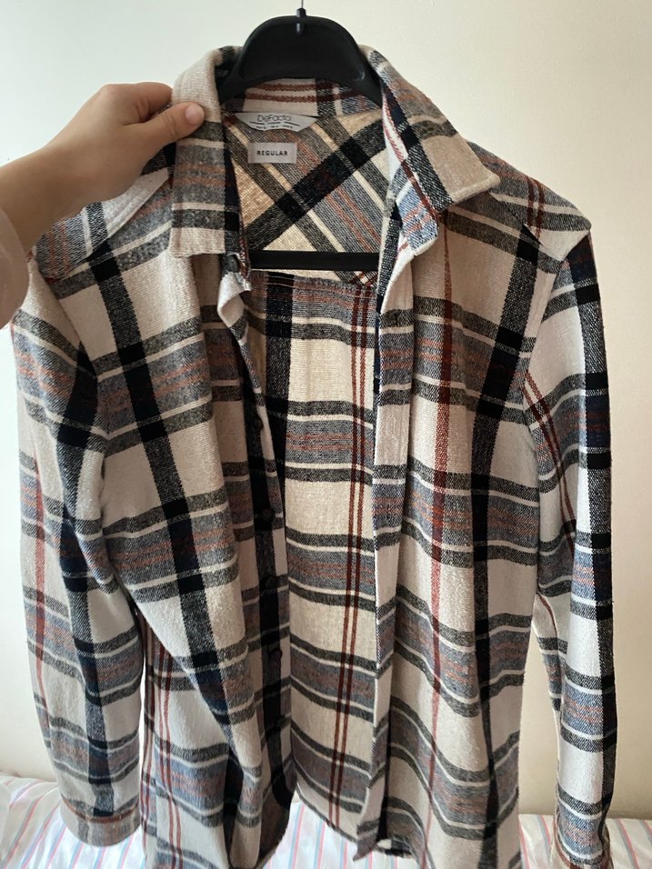 Bej renkte, uzun kollu ve düğmeli önü olan, ekose desenli bol kesim gömlek. Rahat sokak stili için uygundur.