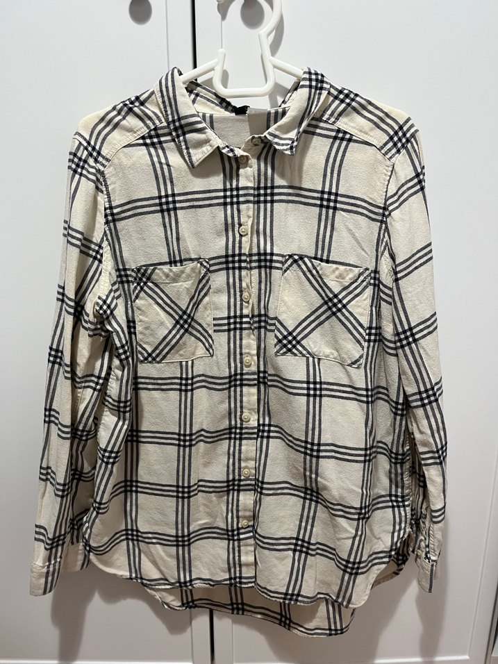 Yumuşak pamuklu kumaştan, uzun kollu, düğmeli, yakalı, cepli, bol kesim bej ekose desenli gömlek. Rahat ve günlük stil için uygun.
