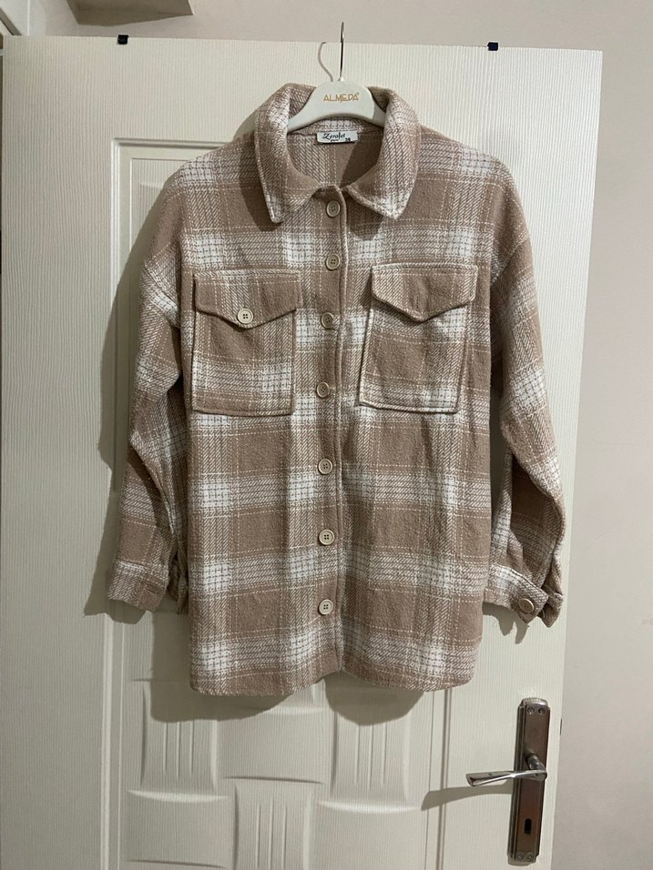 Bej ekose desenli kadın gömlek, düğmeli Bol ve rahat kesimdir