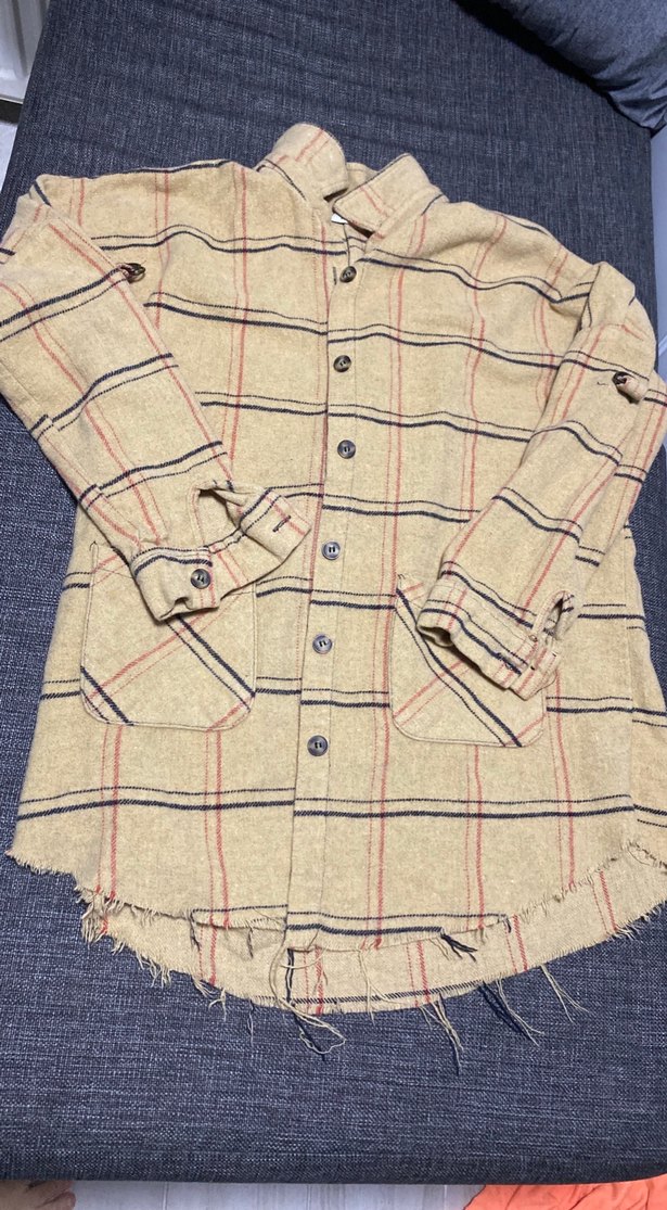 Keten kumaştan, düğmeli ve çıtçıtlı uzun kollu, bej renkli ekose desenli, salaş kesim kadın gömlek. Rahat ve sokak stili için uygun, yıpranmış kenarlara sahip.