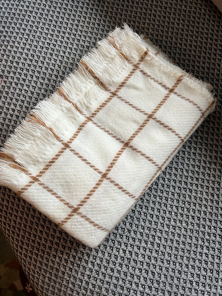 Bej renkte, ekose desenli ve püsküllü kenarlara sahip yumuşacık dokulu atkı, sıcaklık ve konfor sağlar saylı takıldı