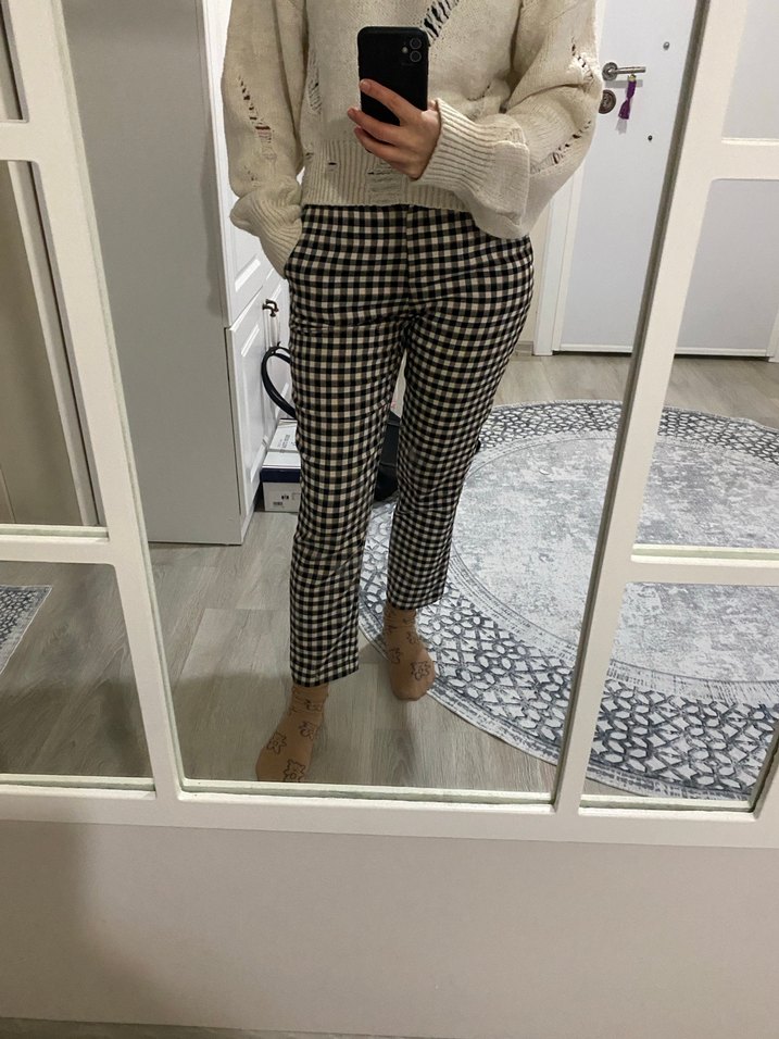 Bej renkte, ekose desenli, bol kesim ve midi boy kadın sigara pantolon. Günlük kullanıma uygun rahat bir stil sunar.