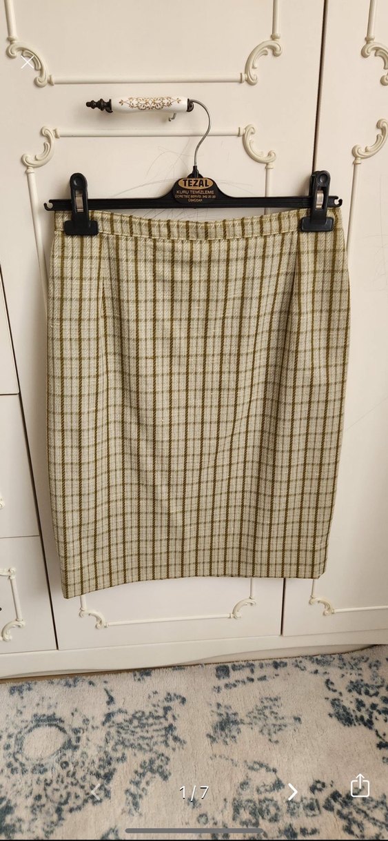 Bej renkli, ekose desenli etek, midi boyda ve fit. Keten dokulu kumaştan, ofis kullanımı için uygundur.