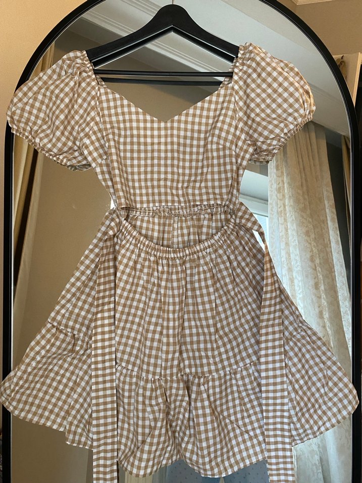 Pamuklu, belden kemerli, bol kesim, V yakalı, bej ekose mini elbise. Günlük kullanım için uygundur.