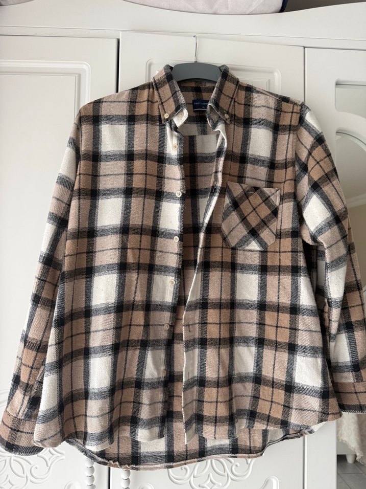 Bej ve gri ekose pamuklu gömlek, uzun kollu, yakalı ve düğmeli ön yapıya sahiptir. Rahat kesimi ve normal midi boyuyla günlük ve rahat sokak stili için uygundur.