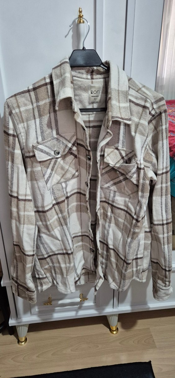 Bej renkte pamuklu, düğmeli, uzun kollu, bol kesim, midi boy kadın gömleği. Notlu yakalı ve günlük rahat stil için uygundur.