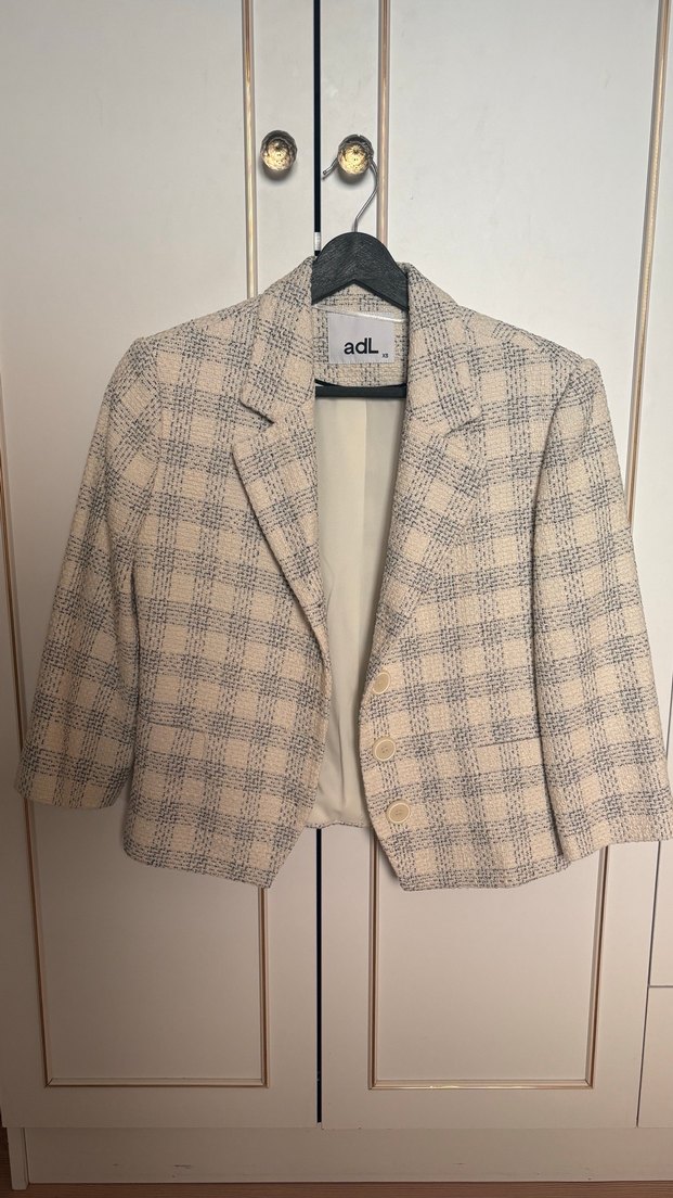 Bej renkli, ekoseli kısa kesim blazer ceket, düğmeli ve uzun kollu, pamuklu yumuşak kumaştan üretilmiştir. Ofis ve günlük kullanıma uygundur.