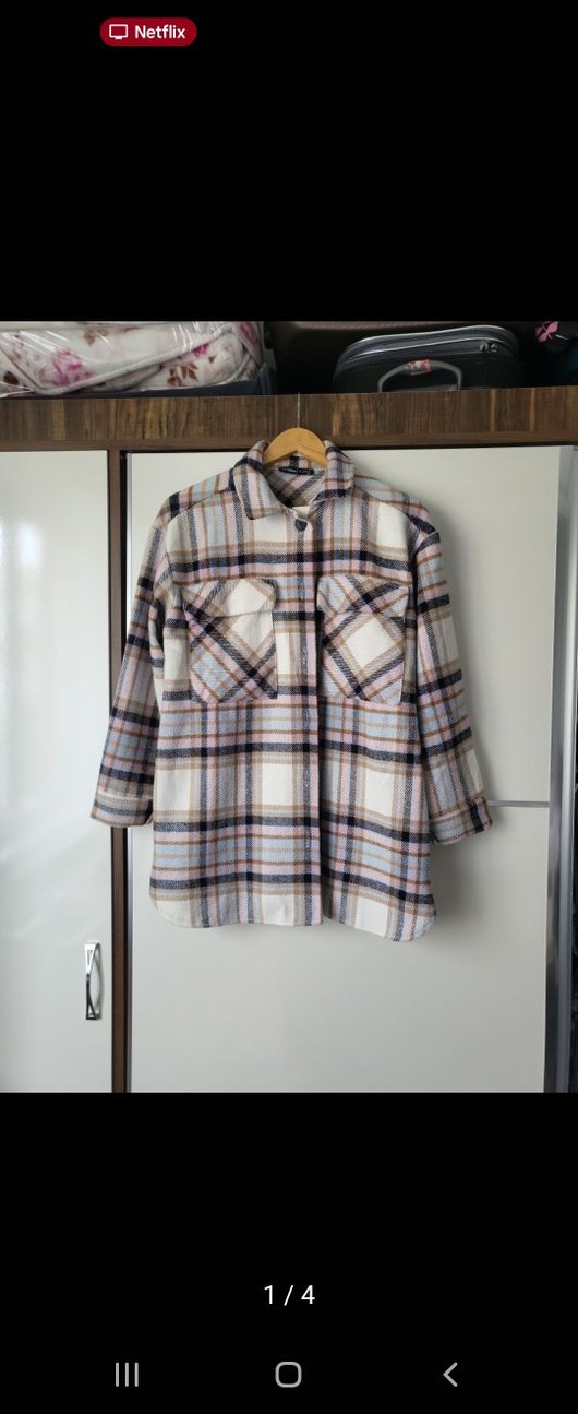 Bej renkte ekoseli, düğmeli, uzun kollu, yakalı, cep detaylı, rahat kesim midi uzunlukta kadın gömleği. Yumuşak ve sıcak kumaştan üretilmiştir, günlük kullanım için uygundur.