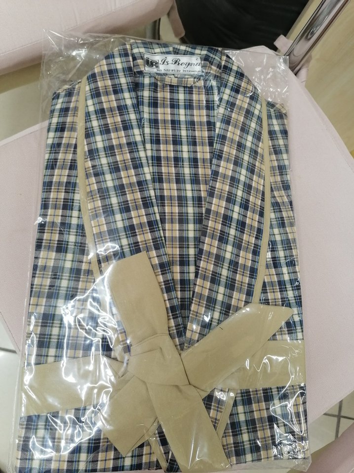 Bej ve mavi tonlarda ekoseli desenli, notched lapel yakalı erkek sabahlık. Strappy kollu ve kemerli, midi boyda rahat kesim.