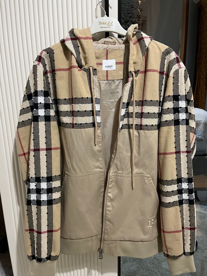 Erkek ceketi, bol kesim ve fermuarlı ön kısmıyla dikkat çeker. Bej sentetik kumaş ve ekoseli desenli kollar ile kapüşon, sokak stilini yansıtır. Uzun kollu ve midi boyda, günlük kullanıma uygundur.